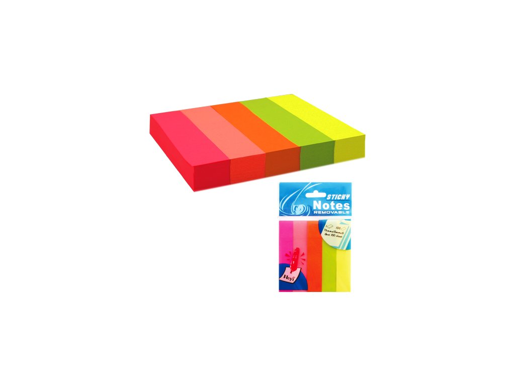 Samolepiace záložky z papiera do kníh, časopisov, alebo ako register do cenníkov v piatich neónových farbách. Lepidlo umožňuje opakované použitie lístkov, pričom nezanecháva stopy. Blok obsahuje 100 lístkov v piatich farbách.Dodatočné parametre