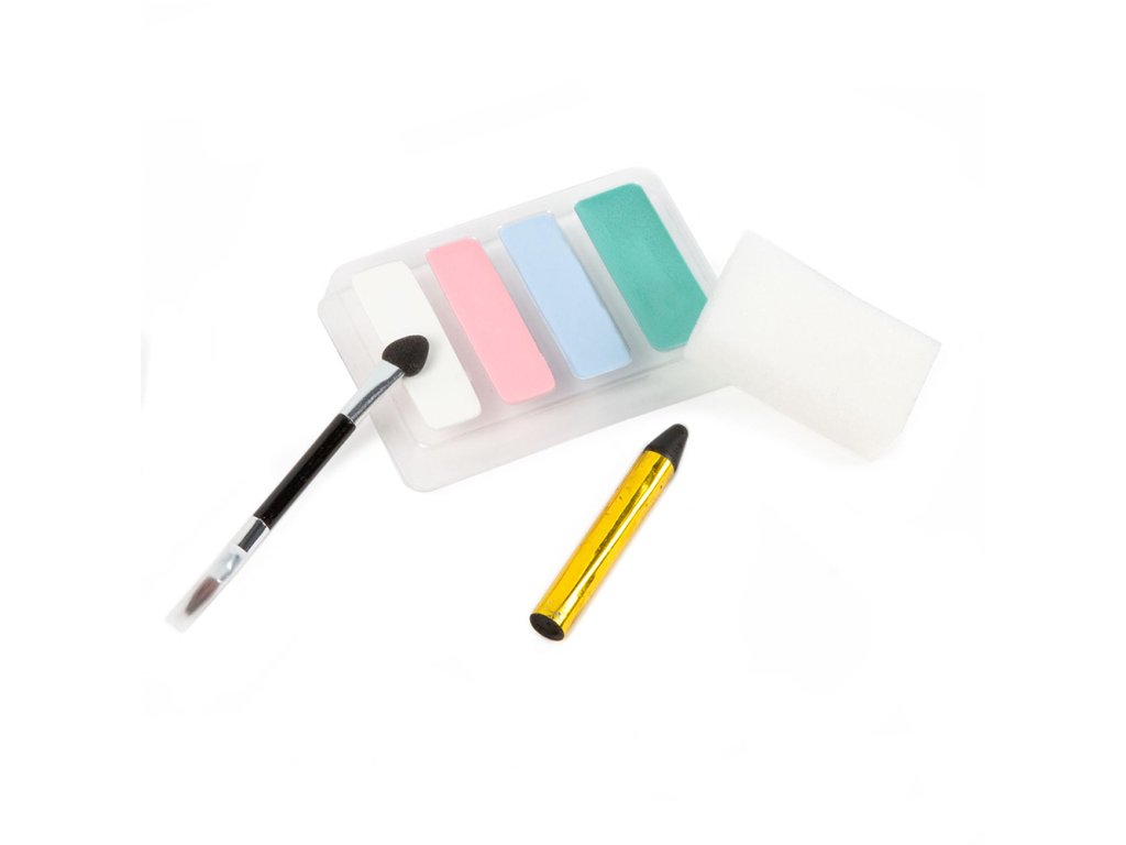 Sada Princess obsahuje 4 pastelové farby, čiernu pastelku, špongiu, obojstranný aplikátor a nálepky na tvár.