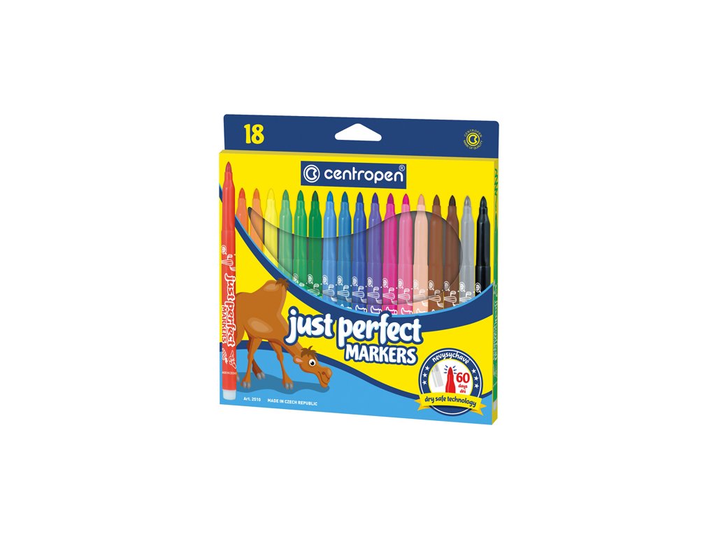 Farebné popisovače JUST PERFECT - sada 18 ks s nevysychajúcim atramentom, ktoré môžu zostať bez chránidla až 60 dní. Vyprateľný atrament. Valcový hrot so šírkou stopy 2-3 mm. Ergonomická úchopová časť.Dodatočné parametre
