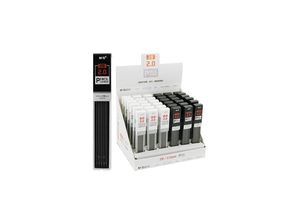 Náhradná grafitová náplň M&G do pentelky. Priemer náplne je 2,0 mm a tvrdosť je 2B. Dĺžka tuhy je 90 mm. Dodávané v plastovom boxe po 5 kúsov.Dodatočné parametre
