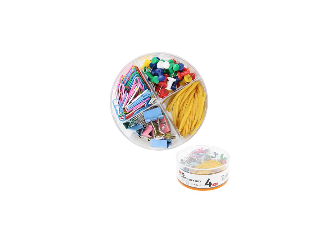 Praktická súprava kancelárskych potrieb M&G 4v1 v praktickom priehľadnom plastovom boxe – sada 200 ks. Sada obsahuje: 50 x farebné pripináčiky, 100 x 29 mm hladké/farebné spony, 10 x 19 mm binder clip, 40 ks gumičky.Dodatočné parametre