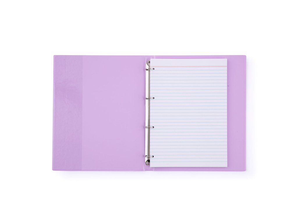 Blok v moderných pastelových farbách s krúžkovou mechanikou, formát A5, 100 linkovaných listov, vnútorná zakladacia zložka. Farba: ružová.