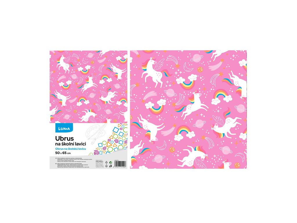 Školský obrus značky LUMA s veselým motívom jednorožcov je praktickým pomocníkom pre každého školáka. Rozmer 50 × 65 cm ideálne pokryje lavicu a ochráni ju pred farbami, lepidlom, pastelmi či iným neporiadkom počas výtvarnej výchovy alebo kreatívnych činností.
