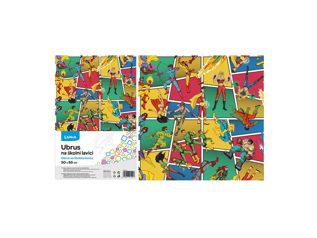 Obrus na školskú lavicu LUMA – Superhrdinovia je ideálnym doplnkom pre každé dieťa, ktoré miluje akciu a fantáziu. Vďaka rozmeru 50 × 65 cm perfektne pokryje štandardnú školskú lavicu a ochráni jej povrch pred farbami, lepidlom či nečistotami počas kreatívnych aktivít.