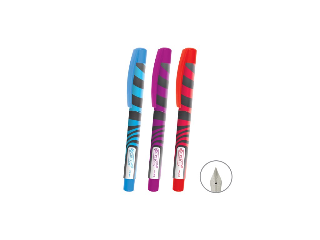 Školské atramentové pero na bombičky, plastové telo a vrchnák s farebnou potlačou, dodávané bez bombičiek, v troch farebných prevedeniach.Dodatočné parametre