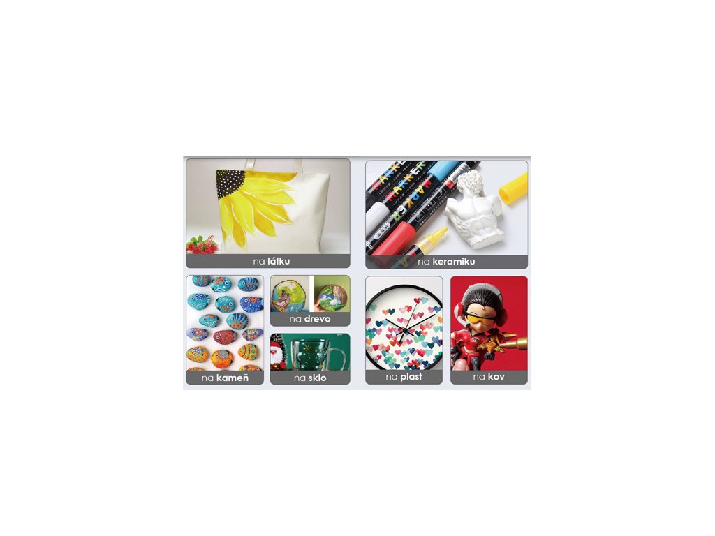 Dekoračný popisovač je vhodný na maľovanie povrchov ako: kameň, keramika, porcelán, sklo, drevo, textil, plátno, kov, drevo, plast, polymérová hlina a pod.