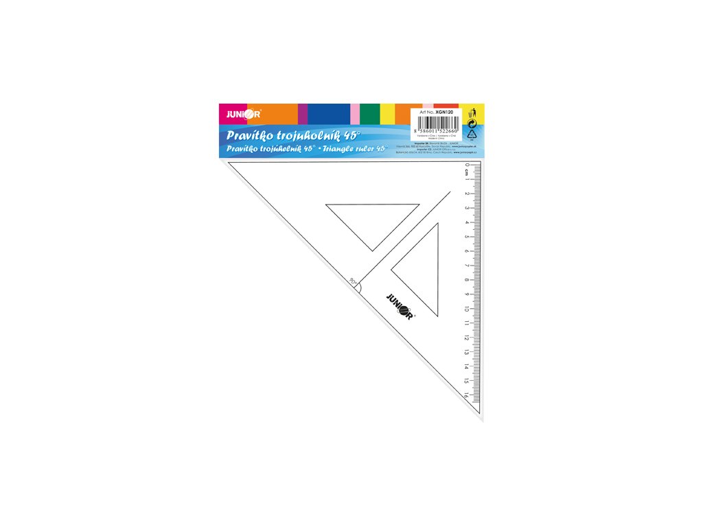Trojuholník s ryskou, s pravítkom na pravej odvesne 16 cm, vyrobený z transparentného PVC.