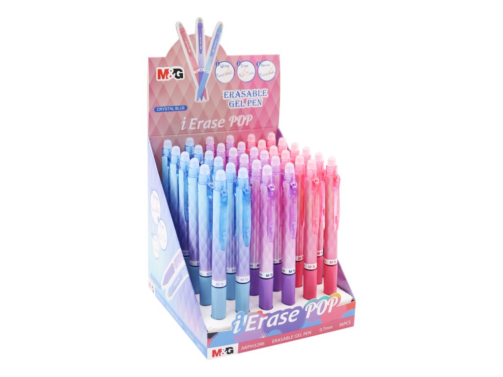 Gumovací roller od značky M&G, ktorý sa predáva v troch farebných prevedeniach. Farba náplne je modrá. Stopa hrotu je 0,7 mm. Klip slúži na vysunutie hrotu von a zasunutie zasa nazad do tela pera.Dodatočné parametre
