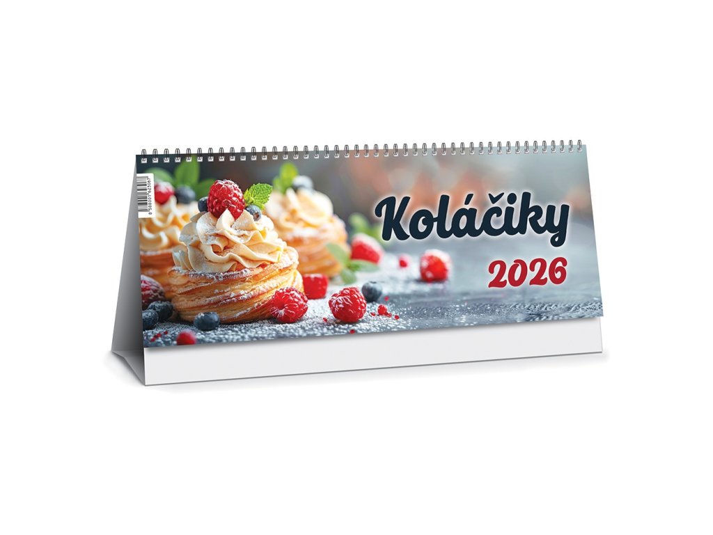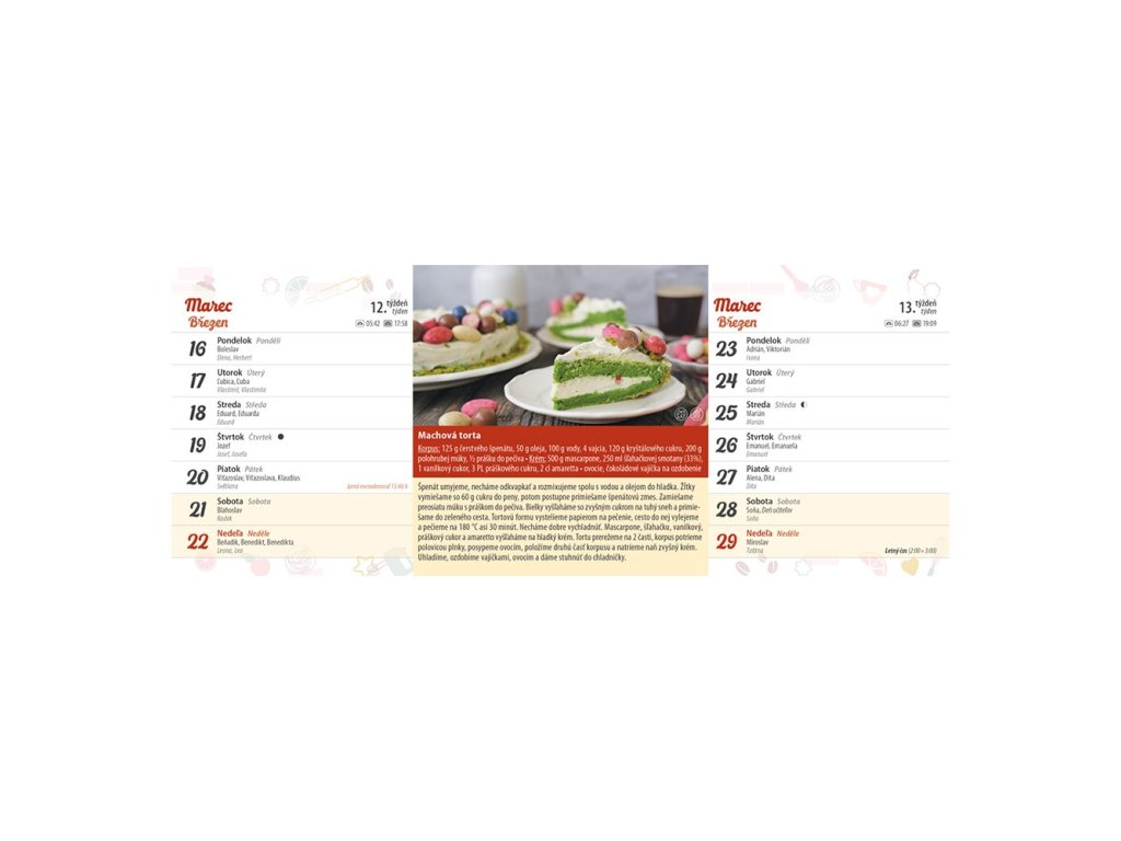 Formát: 300 × 120 mm. Vario špirála, natieraný lesklý papier, 32 strán. Cena za 1 ks výrobku. Za každým dobrým obedom by mal nasledovať dezert, hovoria naše staré mamy. Výber najlepších a nenáročných sladkých i slaných koláčikov vám ponúka dvojtýždňový stolový kalendár s receptami, informáciami pre alergikov, východmi a západmi Slnka, slovenskými a českými menami (plus netradičné mená). Možnosť potlače na presah podložky (300 x 35 mm).