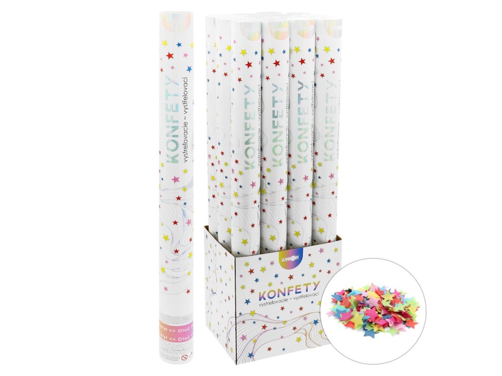 Vystreľovacie párty konfety – serpentíny s rôznofarebnými papierovými hviezdičkami dodajú každej oslave neopakovateľnú atmosféru.